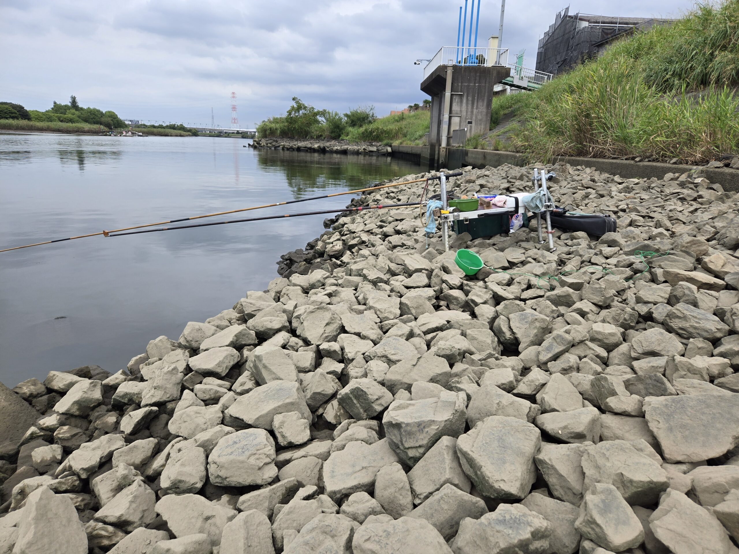 12時頃到着、水位が上げてきても移動しなくて良いように、下流側から釣りたかったのですが、釣人がいたのでゴロタの上からです。
