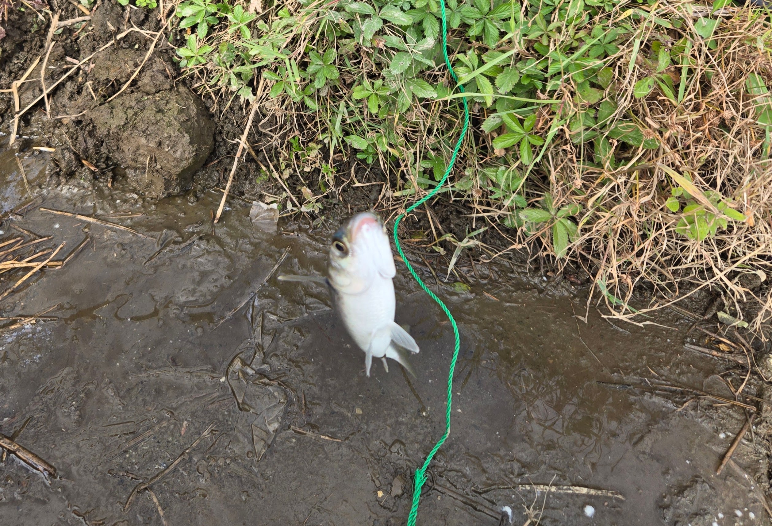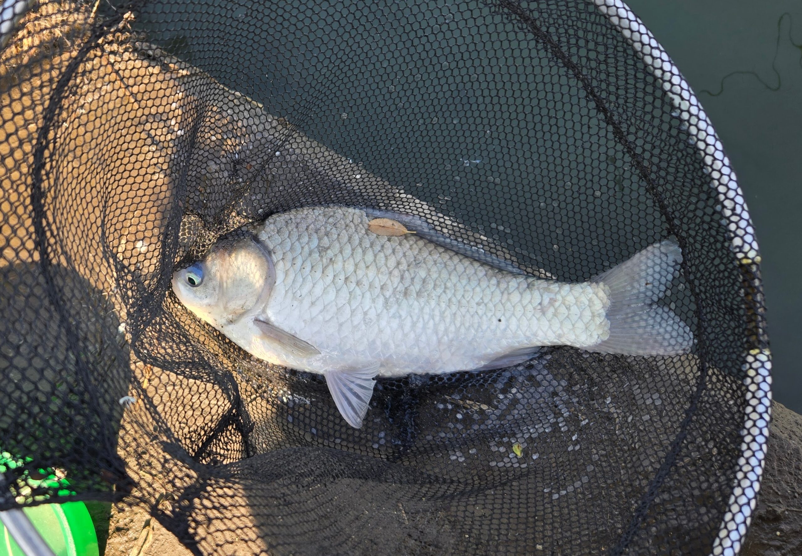 軽く合わせると重い手応え、なんか変だなと思っているとヘラ、胸ビレの付け根にスレ掛かりしていました。