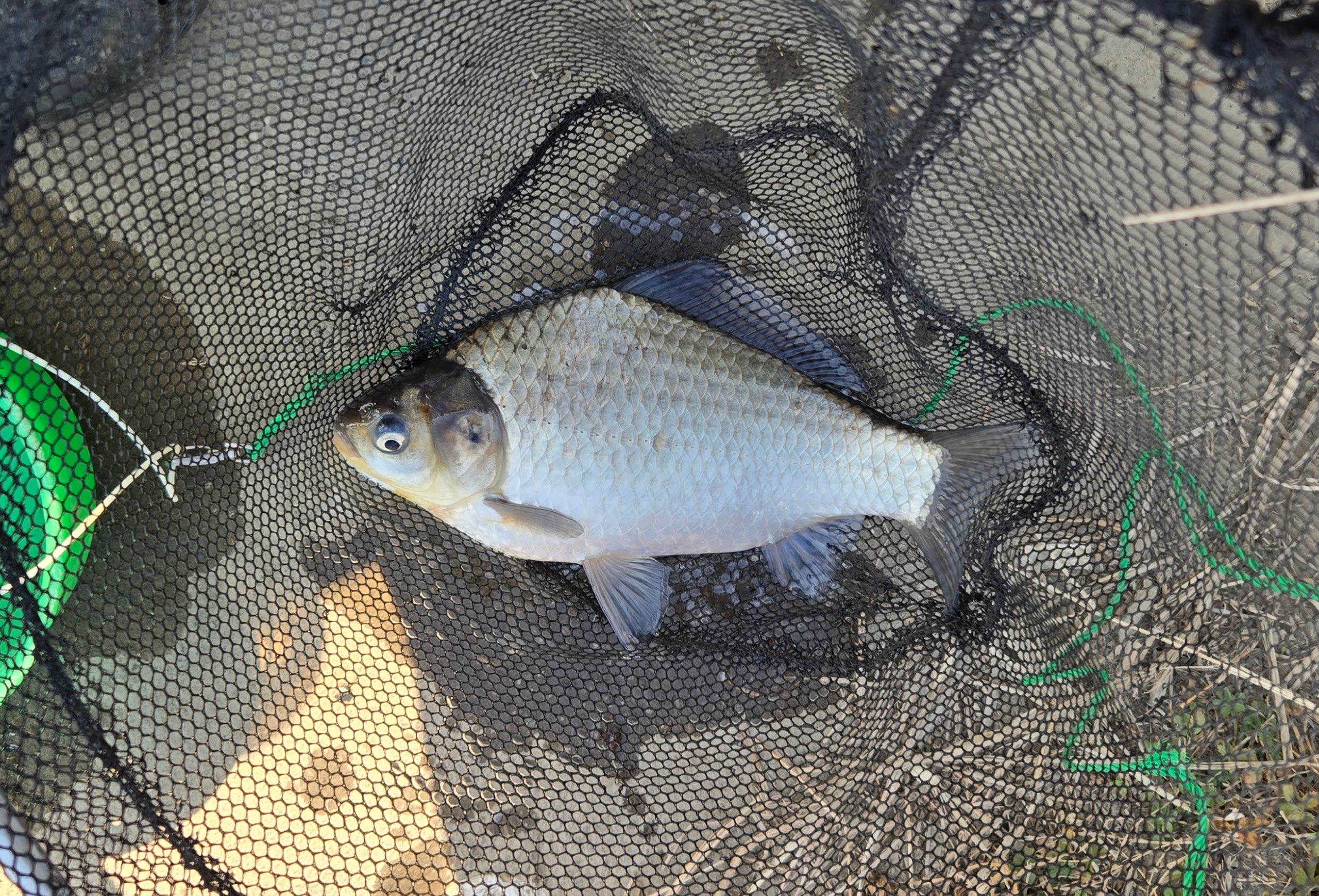 Tさんがコイ用の玉網を持って来くれたのですが、ヘラの網で掬えると思って無理して失敗しました。